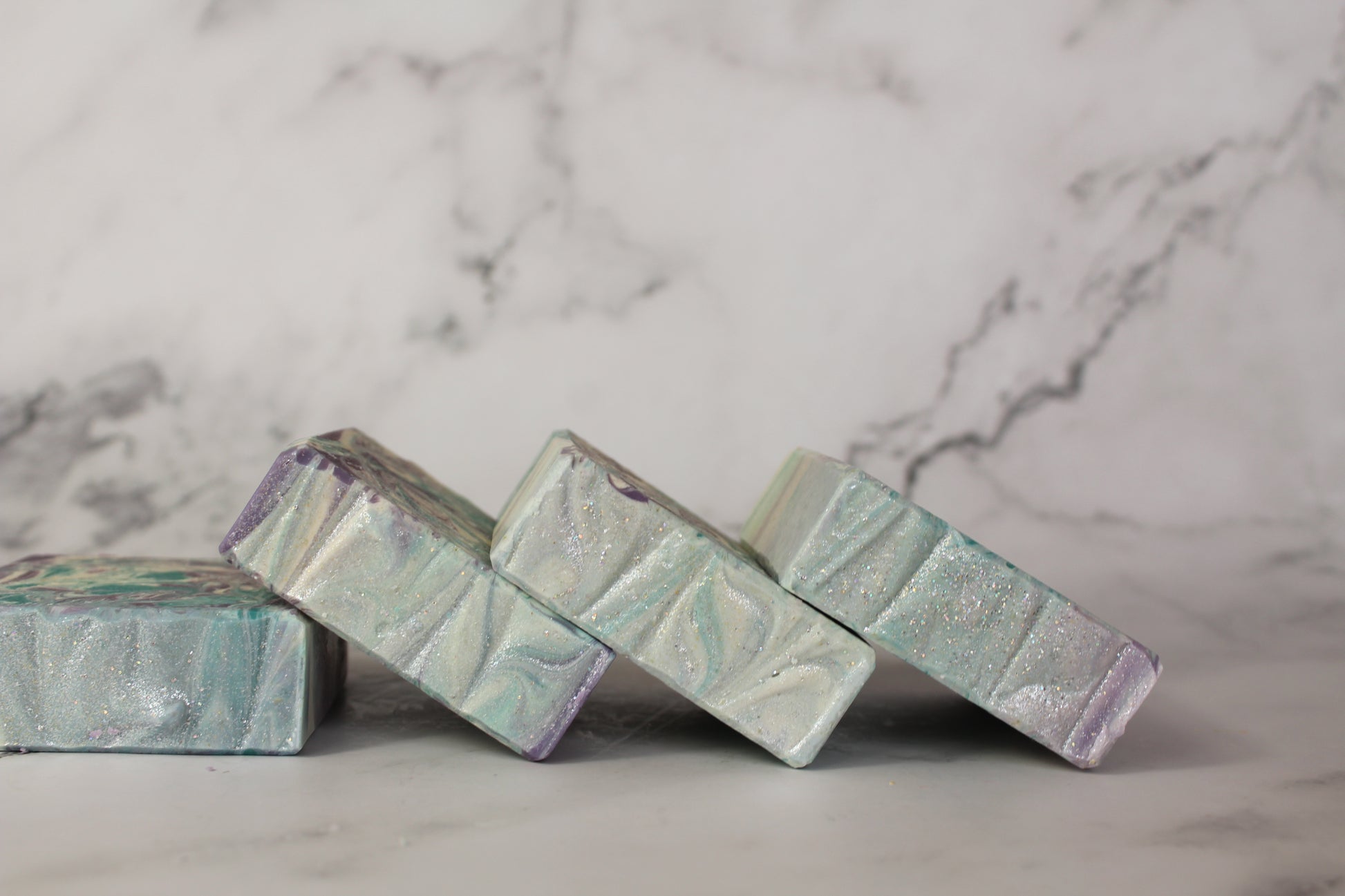 Ingredients: Goat Milk, Sodium Hydroxide, Organic Coconut Oil, Organic Olive Oil, Organic Palm Oil, mica, titanium dioxide, chromium green oxide, tin oxide, manganese violet, eco glitter, fluorpholgopite and Fragrance Oil